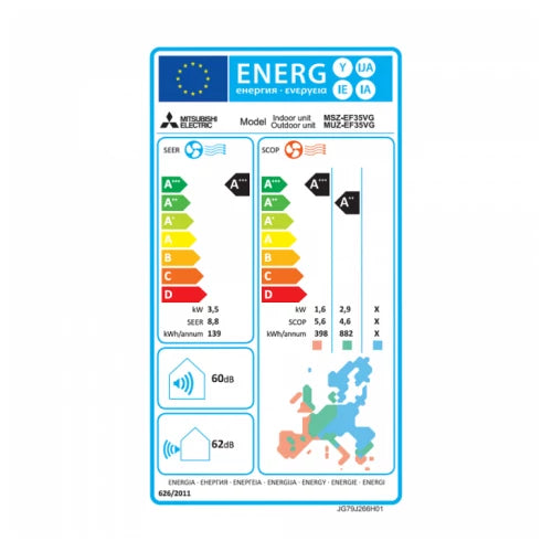 Az MSZ-EF Oldalfali készülékek a legjobb energiahasznosítási értékeket érik el. A jövőbe mutató inverteres technológiának köszönhetően a Mitsubishi Electric díjnyertes Oldalfali klímaberendezései a legmagasabb hatásfokot érik el, amely már ma teljesíti az Ökodesign irányelv szerinti A+++ energiahatékonysági osztály követelményeit.